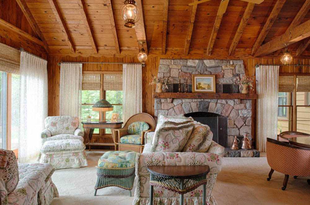 - Кантри. Деревянные перекладины – важная деталь в стиле кантри. Большие помещения оформляются вычурными брусовыми конструкциями. Маленькие же комнаты отделывают досками из дерева, расположенными в подобных направлениях, характерных для стиля.