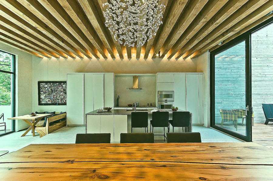 Вот здесь уж точно можно сказать, что в городских условиях монтаж декоративных балок на поверхность потолка не представляется возможным. Да и чисто с позиций целесообразности проку здесь, определенно, мало. Для того, чтобы задействовать этот дизайнерский прием, необходимо полноценное свободное пространство — и в формате пригородного дома актуальность использования становится осязаемой.