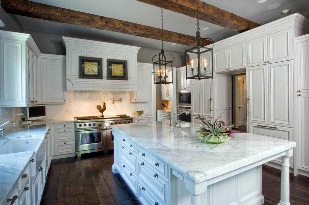 Если ваша кухня изобилует белоснежным тоном, то избавиться от ощущения стерильности, некоторой «больничности» можно как раз при помощи декоративных балок на потолке из классического дерева хвойных пород. Единственный совет: не используйте вместе с белым потолком и стенами выбеленные породы — рискуете получить не жилое пространство, а некий безжизненный интерьер, подходящий для каких-нибудь арт-съемок, но только не для комфортного проживания.