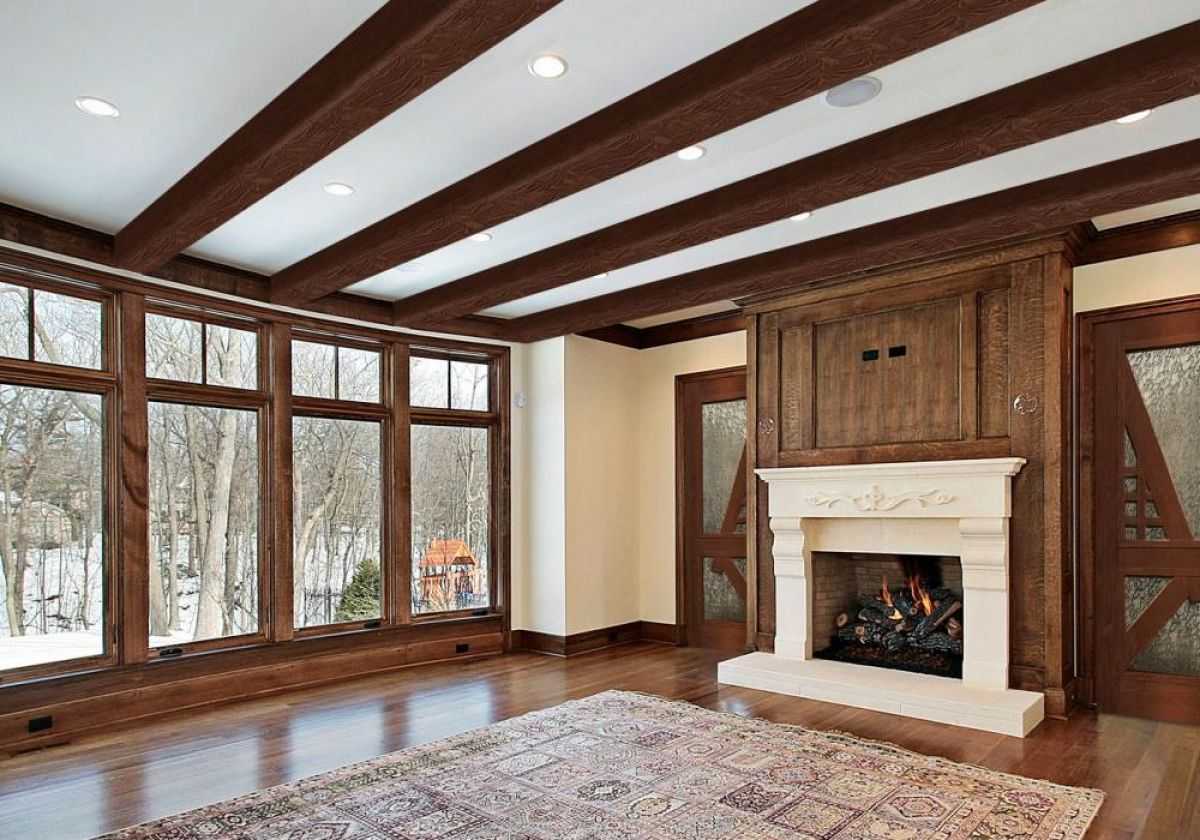 Самый подходящий вариант для размещения. Тут декоративные балки, особенно из натурального дерева, предстают в роли уникального инструмента для создания действительно теплой домашней атмосферы. Эффектным предстает решение использовать их для установки центральных люстр или любых других источников освещения. Нередко балки являются составной частью деревянной панельной конструкции — в таком случае они выполняют дополнительную роль поддержки.