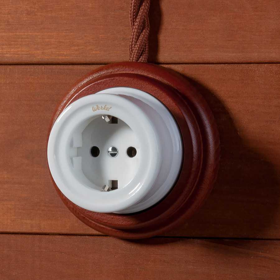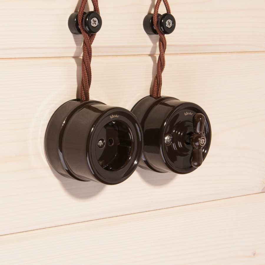 На деревянных или глинобитных стенах проводка крепится открытым способом, так как углублять ее небезопасно с точки зрения правил пожарной безопасности. На такую стену устанавливается розетка с подрозетником. Если речь идет о, например, парной, то монтаж провода необходимо проводить с использованием специальных пластиковых коробов.