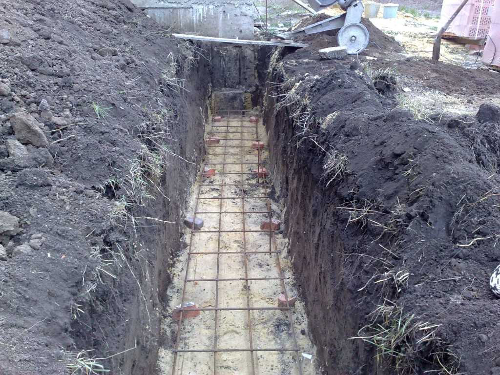 Для удобства, чтобы залить ростверк ровно (по уровню) забиваем в траншею арматуру на необходимую высоту бетона (фото выше).