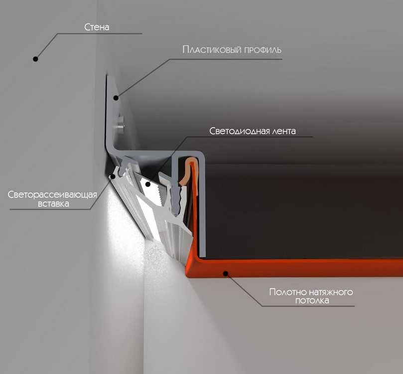 - Устанавливают конструкцию на специальных багетах, имеющих паз для светодиодной ленты и зазор для рассеивания световых потоков.