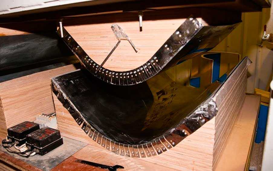 При разработке каркаса учитывают тип прижимного устройства. Чаще всего это струбцины. Для губок струбцины на фанерных вкладышах оставляют отверстия, а сам каркас усиливают дополнительными ребрами, чтобы создать необходимую растягивающую или прижимную нагрузку. В простых случаях сгибаемый лист можно фиксировать тросом или веревкой.
