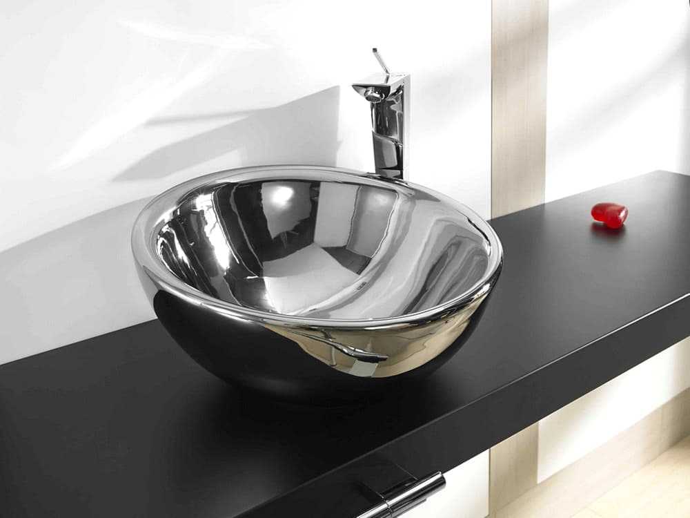 Стеклянная раковина для ванной комнаты круглая металлическими. Изготавливаются из нержавеющей или обыкновенной углеродистой конструкционной стали. У последних поверхность защищается от коррозии эмалью. Применяются редко.