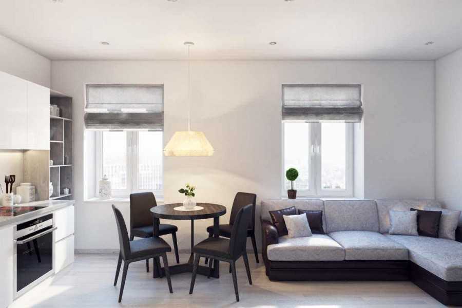 За счет этого решения получится расширить общую площадь, что позволит разместить полноценную обеденную группу и гарнитур, а также установить полноразмерный диван.