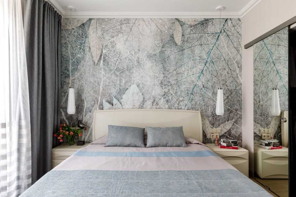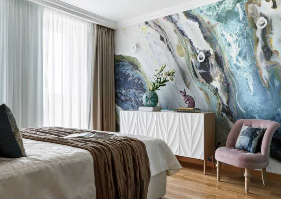 Модный дизайн спальни 2022 года — «воздушная» классика: сочетание нежных голубых, лиловых тонов в отделке с белой мебелью. Посеребренные элементы декора, патинирование органично дополняют концепцию «воздушного» классицизма.