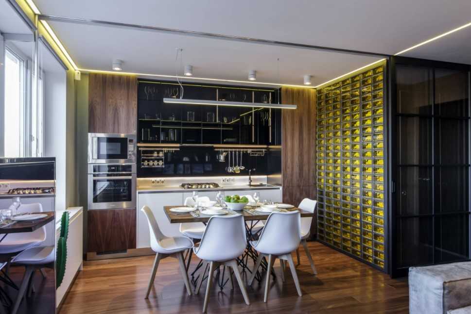 В данном стиле можно найти лаконичный черно-белый, молочный или серо-белый интерьер с незаметными ручками на гладких фасадах и простую мягкую мебель. Например, кухня-гостиная в современном исполнении может включать: