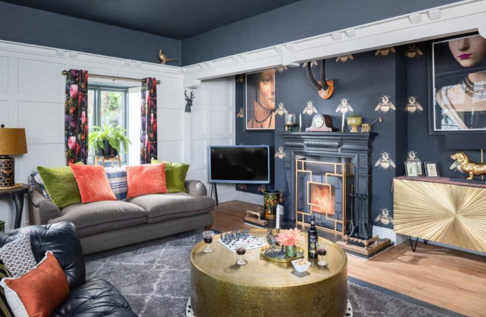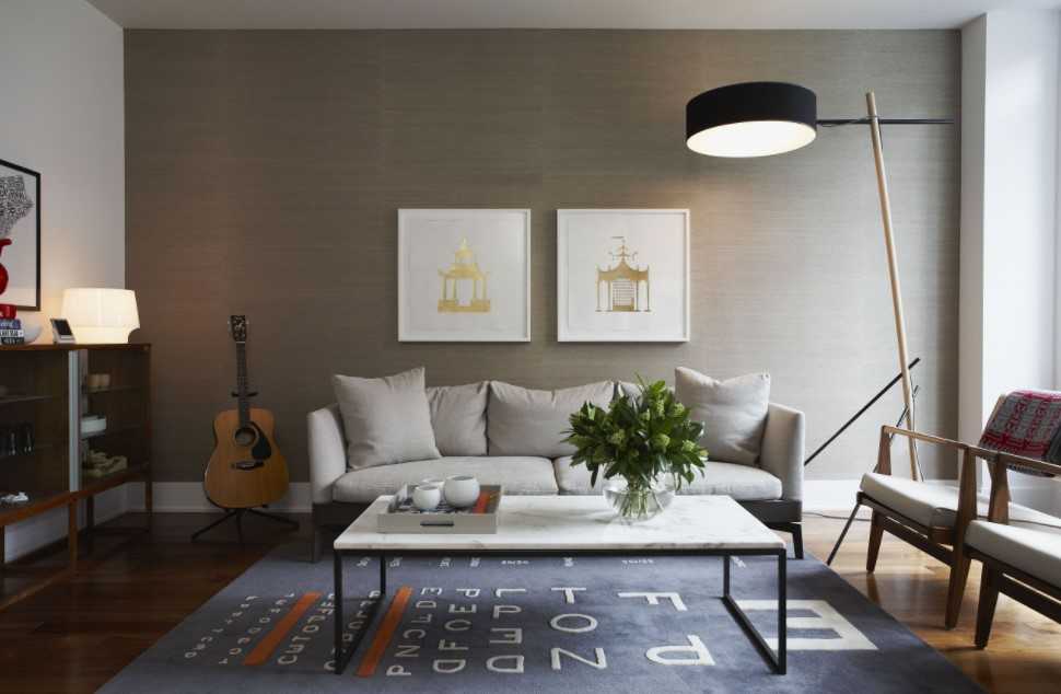 Современный дизайн гостиной с красивыми обоями