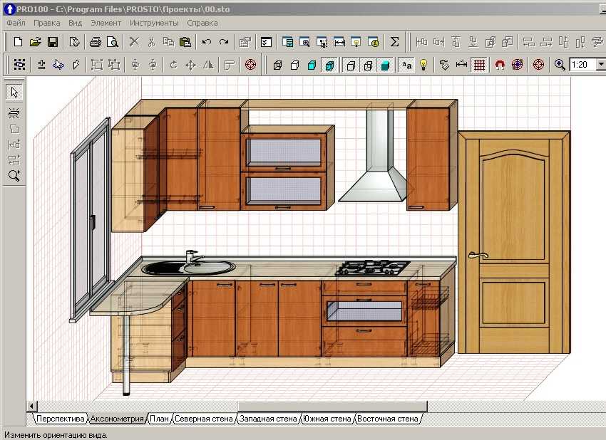 - рассчитываются габариты, количество шкафов с учетом плиты, холодильника и другой бытовой техники.