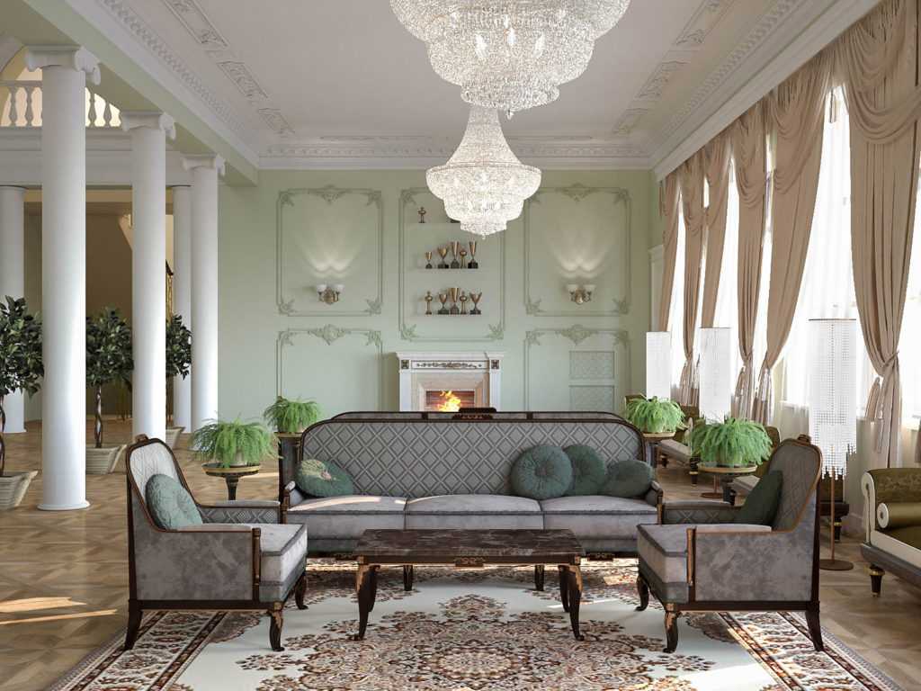 Не следует экономить на материалах мебели – от использования натуральной древесины, венецианской штукатурки, алебастра или гипса обстановка только выиграет. Главное, чтобы мебель совмещала в себе массивность и изящество, а также была расставлено строго симметрично.