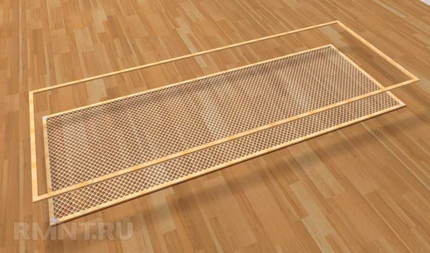 Готовая рама кладется горизонтально, открытым желобом-пазом вверх. Выбранное ячеистое полотно выкраивается с припуском (от 3-х см, но лучше, если 10-15 см). Затем готовое полотнище кладется поверх рамы. Расправляется и по контуру придавливается грузиками.