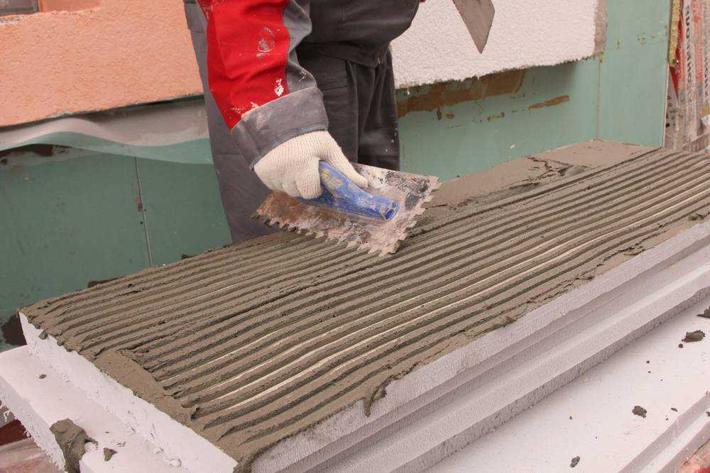 - Наносить клей на лист пенополистирола следует точечно. Один фрагмент размером 1х0,5 м потребуется намазать в 6-7 местах.
