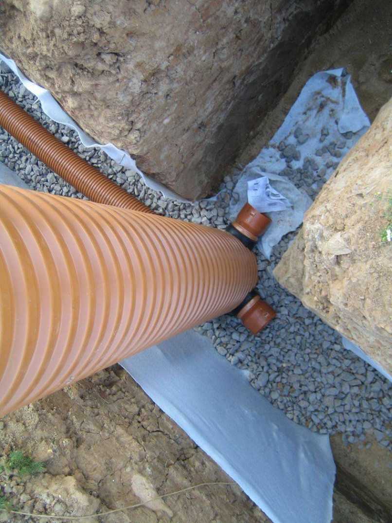 - В случае если на участке повышенный уровень грунтовых вод, или есть колодец, необходимо сделать дренаж. Для этого на дно траншеи кладут слой песка, поверх которого укладывают слой геотекстиля. Далее укладывается слой гравия и перфорированная труба заполненная гравием, которую дополнительно обматывают геотекстилем. Поверх гравия и трубы засыпают слой песка. Трубу необходимо отвести в дренажный колодец или в ближайший коллектор.