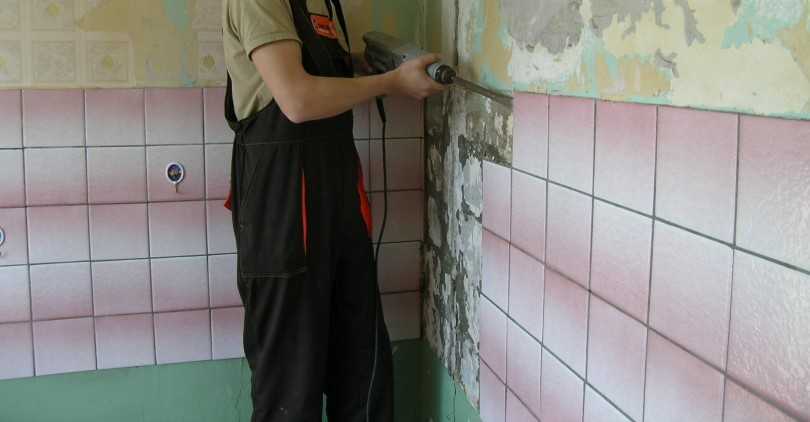 Перед началом работ необходимо демонтировать старое покрытие, если имеется таковое. Для этого можно воспользоваться перфоратором (если старая плитка не будет использоваться) или ручные инструменты (например, молоток и долото), что позволит сохранить элементы облицовки целыми. После демонтажа поверхность нужно очистить от мусора и пыли.