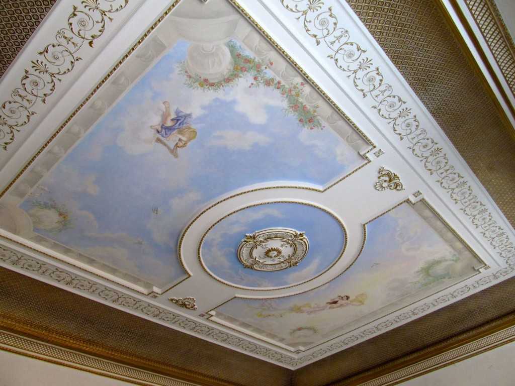 В квартирах с духом аристократичности хозяева предпочитают украшать потолочную поверхность с помощью применения инновационных технологий лепнины и художественной росписи.
