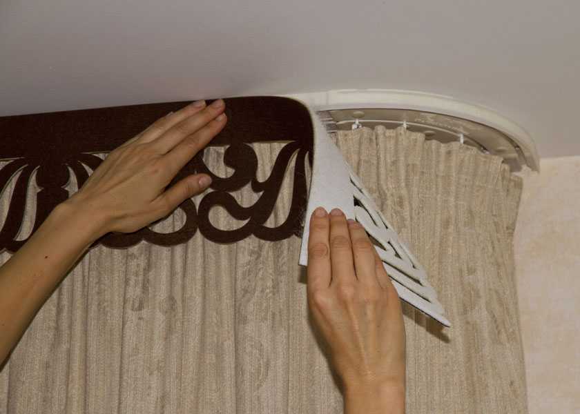 Все, что вам потребуется – немного двухстороннего скотча. По всей длине подвеса для штор наклеивается тонкая полоска скотча и к нему приклеивается декоративная панель. У этого способа есть один недостаток – снять наклеенный элемент без последствий не получится. Даже самый простой двухсторонний скотч фиксирует приклеиваемые детали очень крепко.