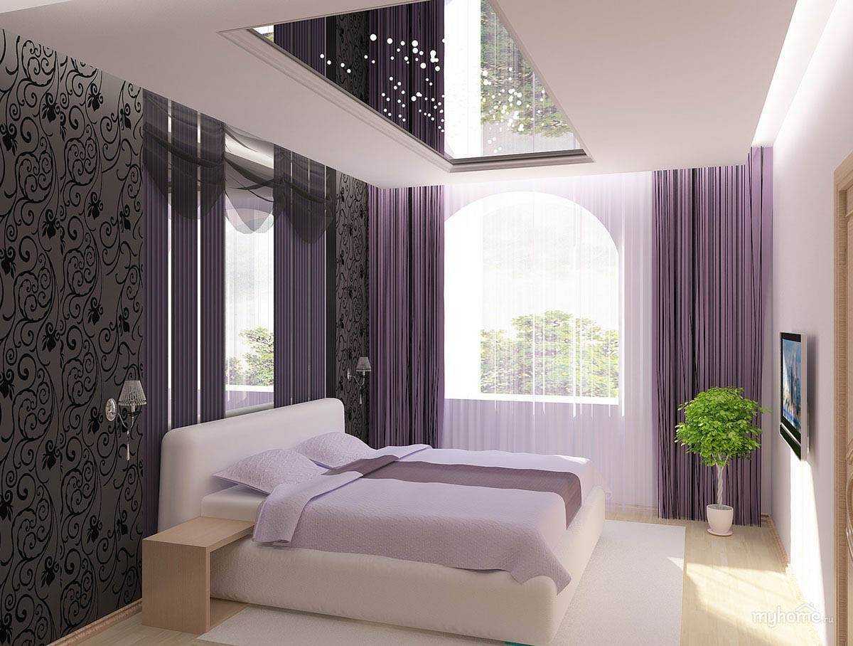 Здесь видно хороший дизайн для спальни. Изюминкой интерьера является повтор рисунка с обоев на тканевом натяжном потолке. Рисунок для потолка подобран правильно, в противном случае интерьер мог получиться перегруженным и чрезмерно пёстрым. В итоге спальня получается тёплой, располагающей к отдыху, в меру яркой и с нужными акцентами.