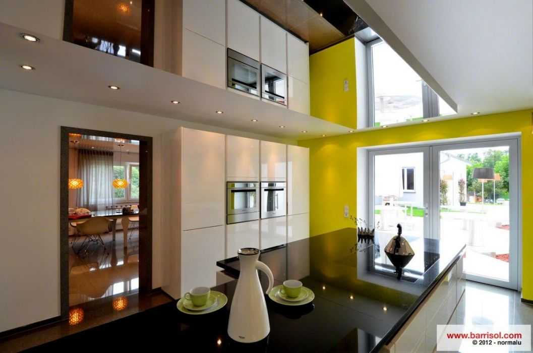 Например, на фото ниже зеркальной ПВХ-пленкой оформлен участок потолка над кухонным островом. Визуально это сразу выделяет кухню в отдельную зону. Стеклянная прозрачная дверь, продублированная в потолочном отражении, еще больше наполняет помещение естественным светом. При взгляде со стороны создается ощущение, что в этой части комнаты вообще нет потолка, а стены продолжаются на втором этаже.
