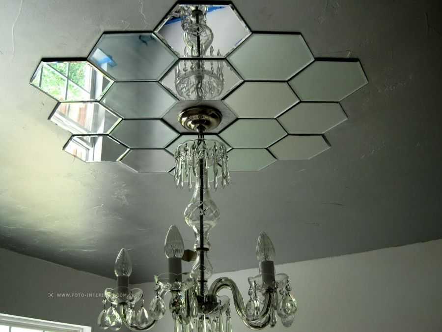 4. Розетка. В подавляющем большинстве комнат центральным объектом на потолке является люстра, расположенная в центре. Розетка – это декоративная композиция, которая подчёркивает координационный центр. Можно сказать, что розетка – это разновидность панно. Мы уже рассматривали в отдельной галерее варианты потолочного декора под люстру, где отмечали, что зеркала – один из популярных материалов для таких случаев. На фото показан пример, как можно использовать шестигранную зеркальную плитку для создания розетки в современном стиле.