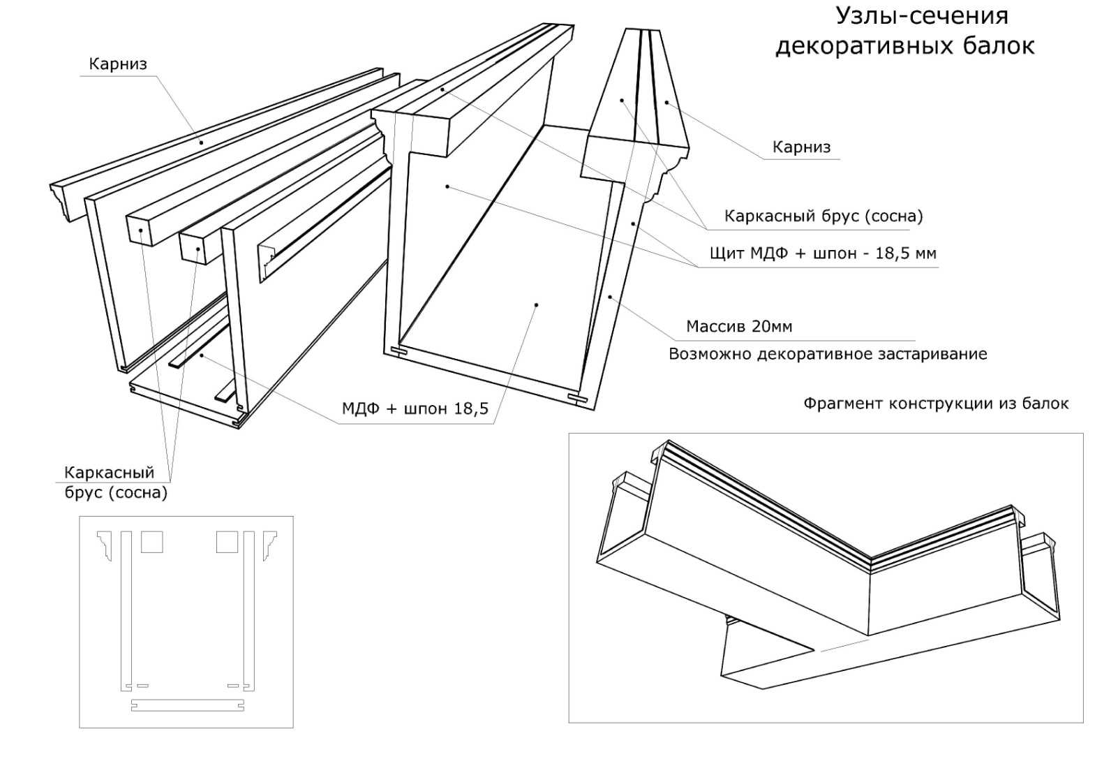 Как и в случае с массивными фальшбалками, предварительно подбирают габариты балок исходя из размеров и геометрии помещения, и схему раскладки. В отличие от балок из бруса, которыми можно имитировать и несущие конструкции ниже уровня потолка, полые используют только для монтажа непосредственно на потолок. Это позволяет экономить пиломатериалы и изготавливать их в виде трехстороннего короба. Как и брус, доска для фальшбалки на потолок должна быть сухой; повести короб не поведет, а вот швы на изделии могут проявиться, несмотря на разные подгонки и крепеж. Для повышения прочности соединение элементов обычно комбинированное – крепеж и клей или система шип-паз, усиленная клеем. Чаще всего все же простой стык элементов и соединение на брусок, так как угловое под 45⁰ или шип-паз требует определенных навыков столярных работ и инструментальной базы, не исчерпывающейся электролобзиком, потребуется фрезер и особая насадка.