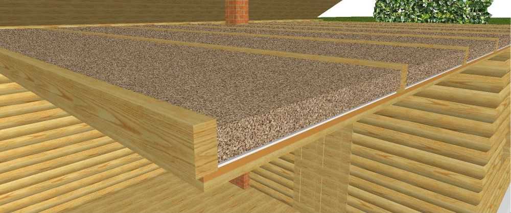 - Пространство между балками засыпается керамзитом. Желательно смешать утеплитель разных фракций, чтобы усадка была меньшей. Минимально допустимая толщина слоя – 200 мм, для регионов с холодным климатом – 400-500 мм.