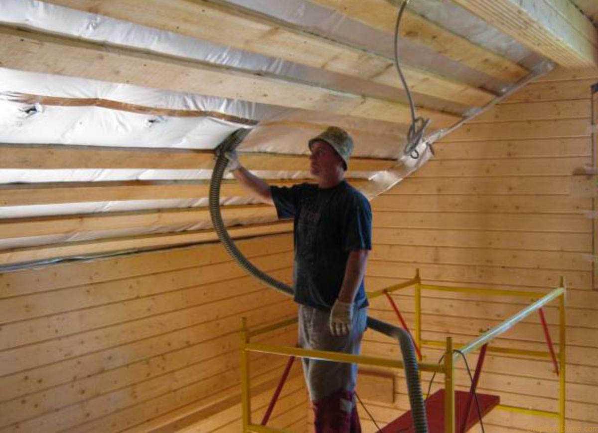 Первые этапы отделки потолка выполняются своим чередом. Деревянную поверхность очищают, обрабатывают антисептиками и антипиренами, монтируют коммуникации. Затем потолок гидроизолируют и укладывают на него утеплитель.