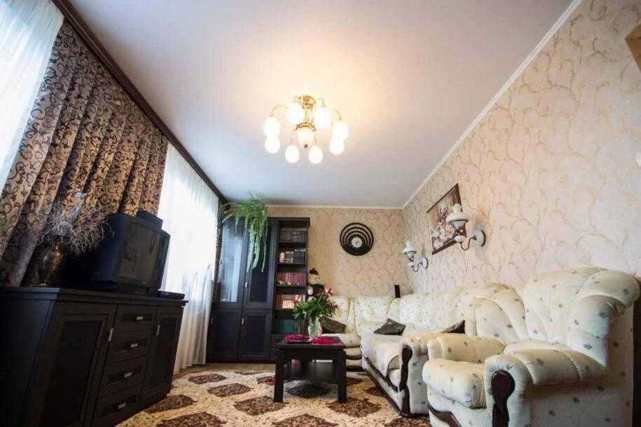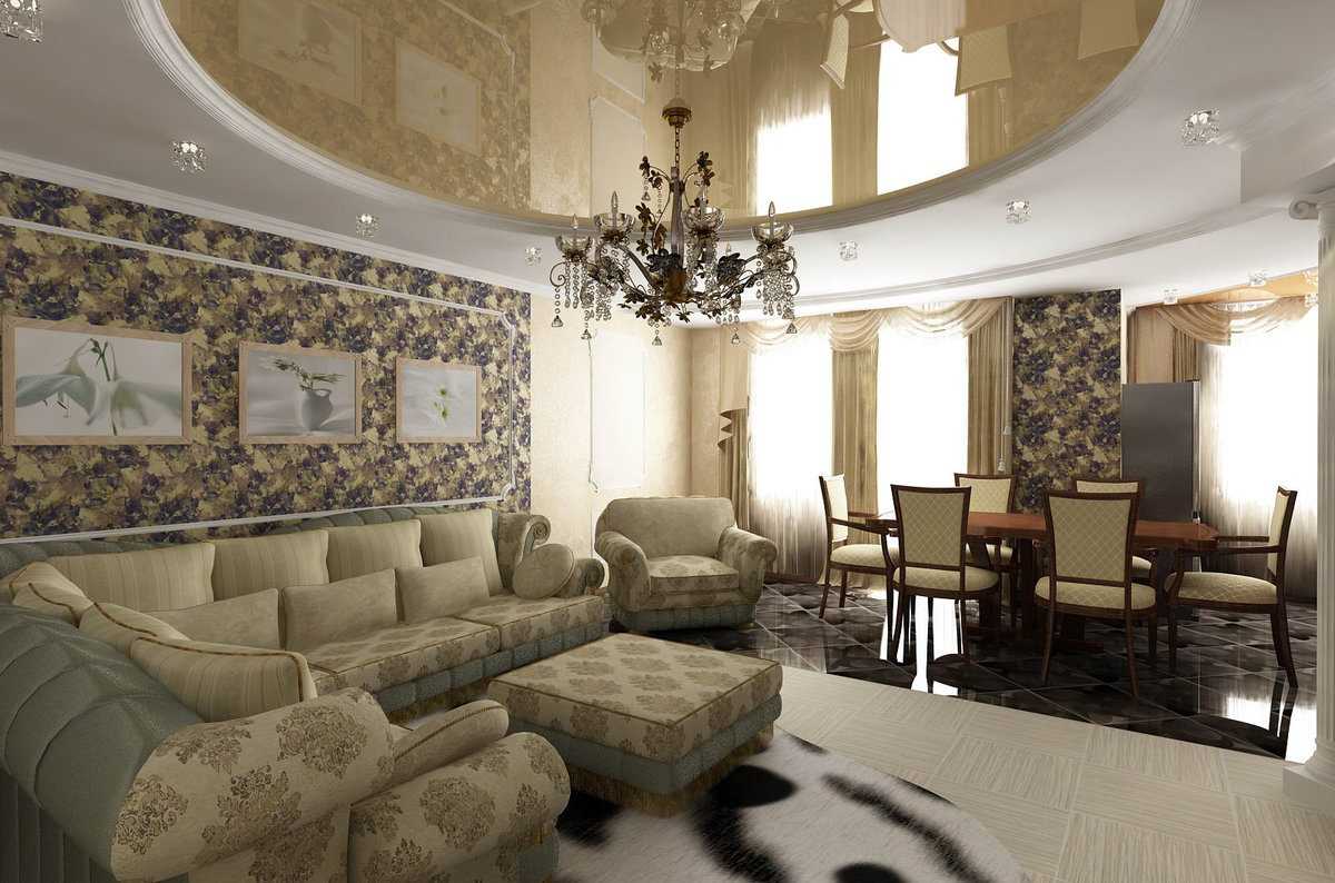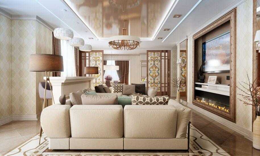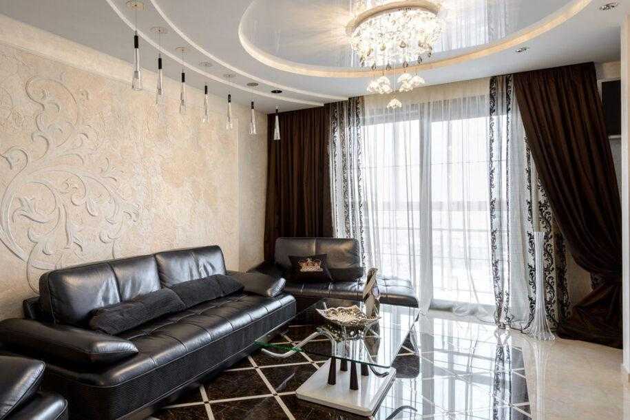 Оформить потолок в вашей гостиной можно тоже разными способами. Если вся квартира в классическом стиле, то традиционные белые потолки, украшенные небольшой лепниной, молдингами – самое правильное решение. Для более современных стилей подойдут натяжные глянцевых и матовых фактур различных цветов. Можно использовать даже яркие цвета, ведь они задают настроение всей комнате.