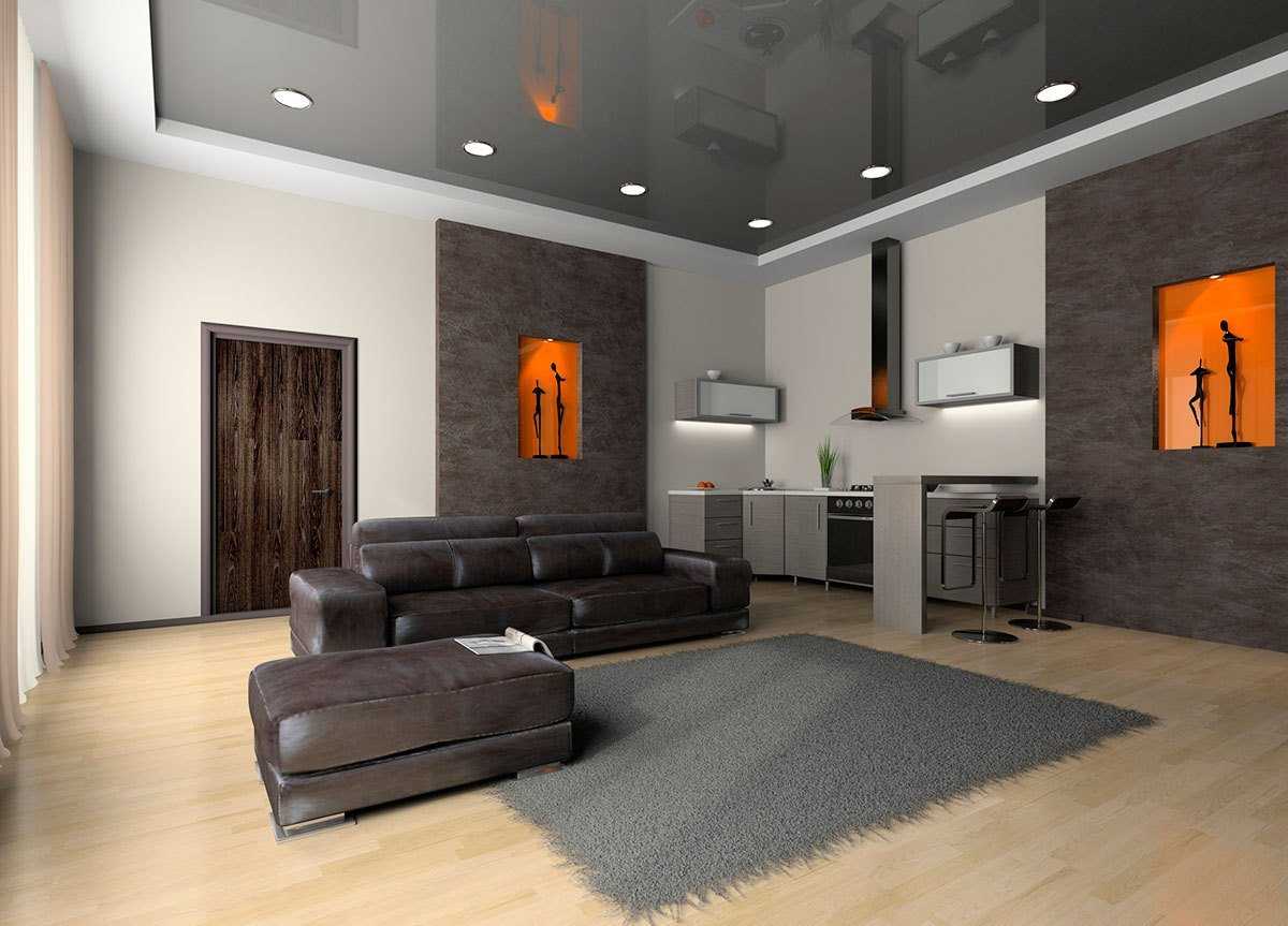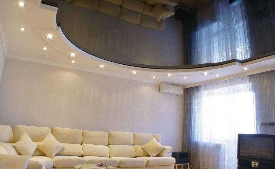 Отлично смотрятся зеркальные потолки или с эффектом отзеркаливания. Оригинально выглядят конструкции из нескольких уровней, разделяющие общую площадь на зоны, и с разными видами освещения для каждой из них.
