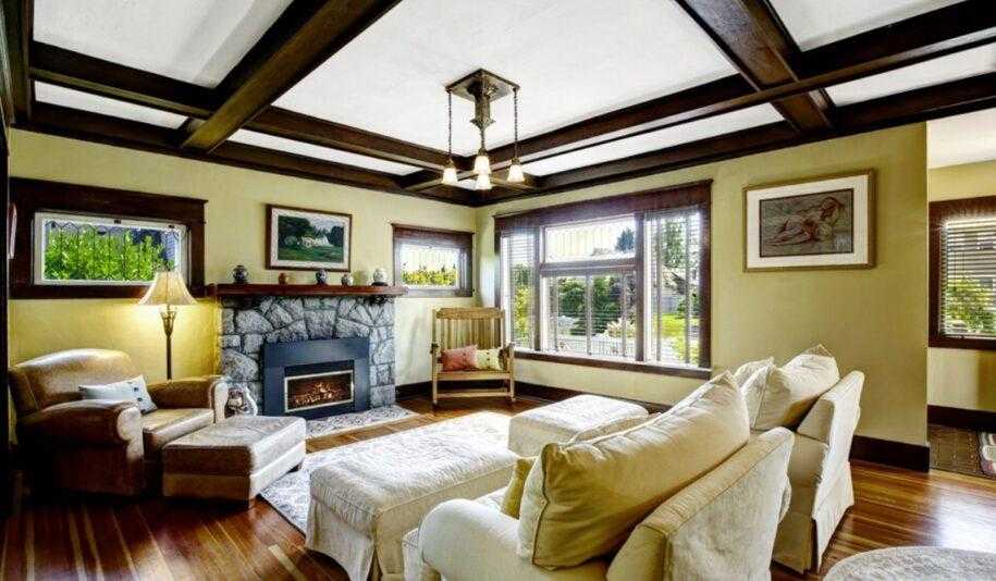 Декоративные балки из натуральной древесины или более дешевых искусственных материалов, делят потолок на определенные зоны и являются прекрасным полноценным элементом декора.