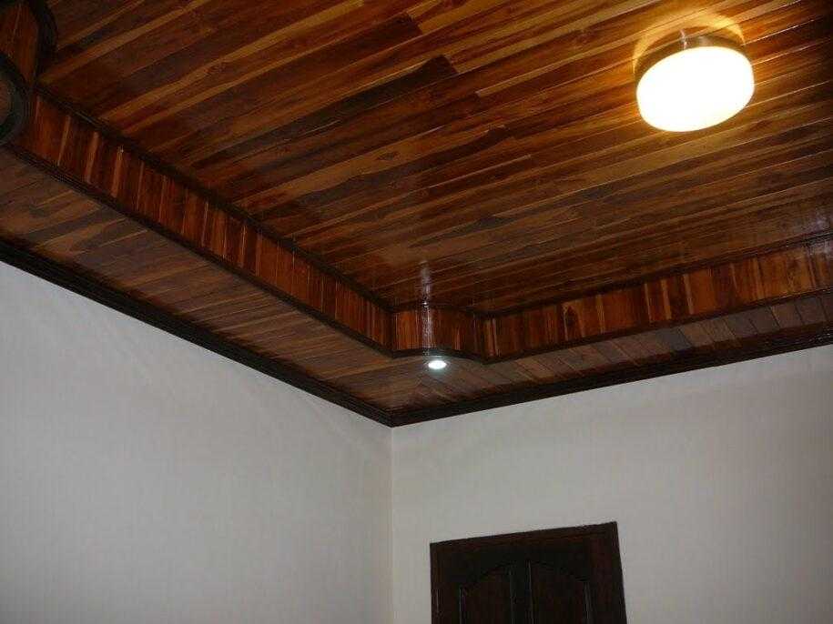 - Гипсокартон — позволяет создать эстетичное покрытие без большой нагрузки на потолок. Отличается экологичностью, но требует шпаклевки и морилки. Используя потолок из гипсокартона, можно замаскировать коммуникации.