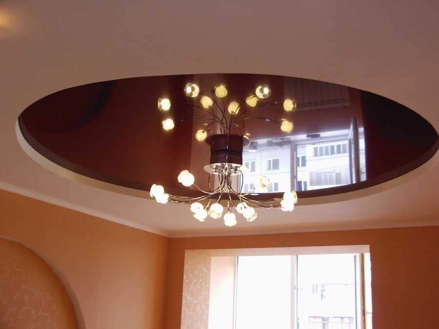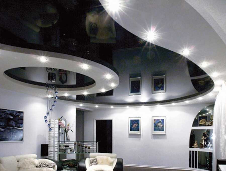 Точечные светильники, расположенные по периметру каждого яруса, способны сделать композицию завершенной и помогают в создании очертания элементов. Игра осветительных приборов помогает создавать неповторимые изделия, которые состоят всего из двух уровней. Каждому гостю понравится имитация космического корабля в гостиной комнате, где он сможет погрузиться в особую атмосферу.
