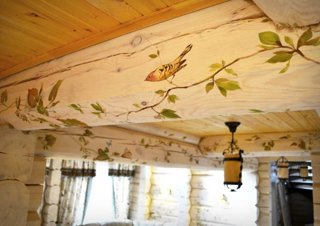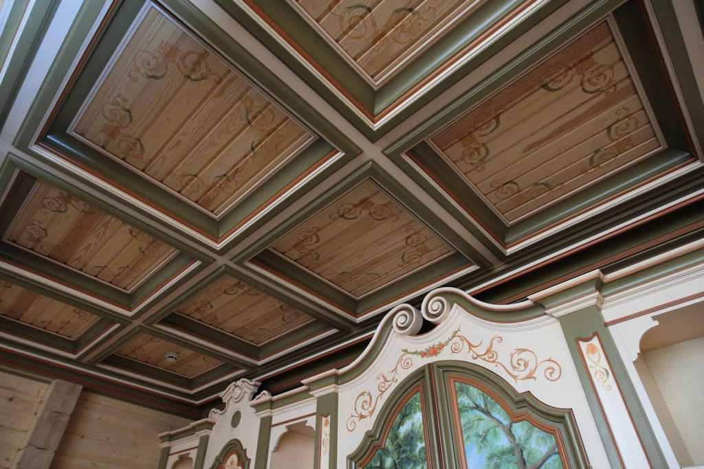 Художественная роспись копирует резьбу, позолоту, лепнину, инкрустацию камнями, наносится на отдельные участки потолка вручную или с помощью трафаретов. Сначала мастер разрабатывает эскиз, определяет цветовую гамму, грунтует поверхность. На фальш-балки деревянного потолка можно нанести патину. Получается эффект потертости и трещинок в различном направлении. Методом полихромной росписи украшают потолки для интерьера в стиле прованс. Незаурядно выглядит альфрейная отделка на поверхности вагонки, массива. На балках, досках рисуют цветные пейзажи, розетки, на фанере создают 3д картинки с имитацией резьбы.