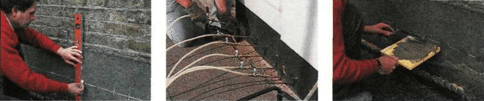 Установка гидроизоляционной прослойки. Полимерная гидроизоляционная прослойка закачивается в просверленные в линию отверстия, отстоящие друг от друга примерно на 115 мм. После закачки в стену полимерные компоненты наслаиваются друг на друга и создают сплошной непроницаемый барьер. Когда жидкость высохнет, просверленные отверстия заделываются раствором; потом оштукатуренную поверхность можно покрасить.