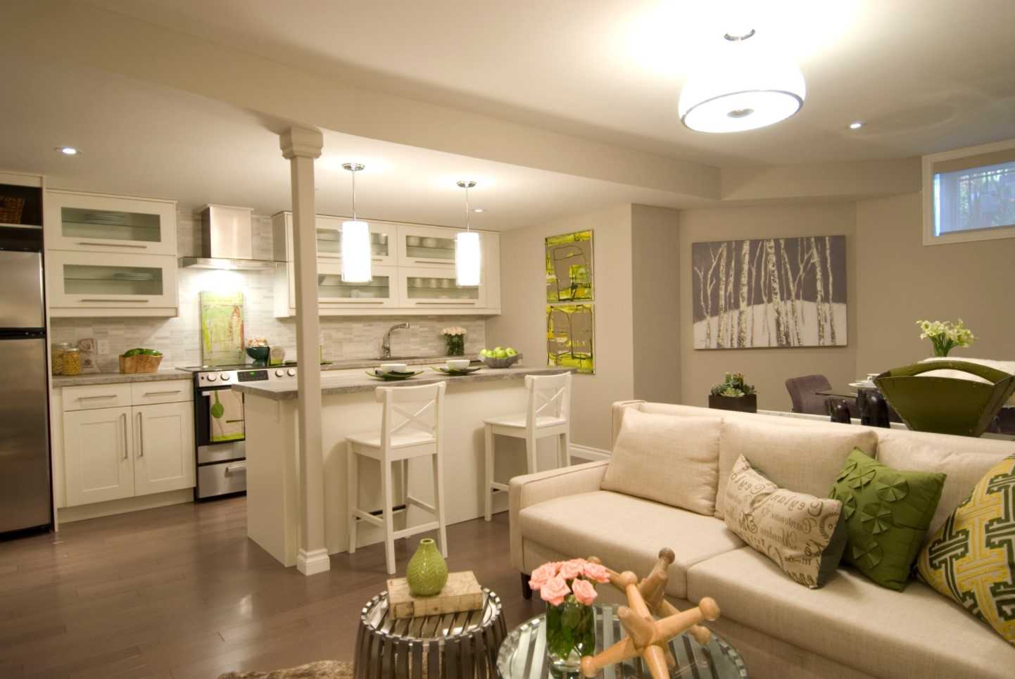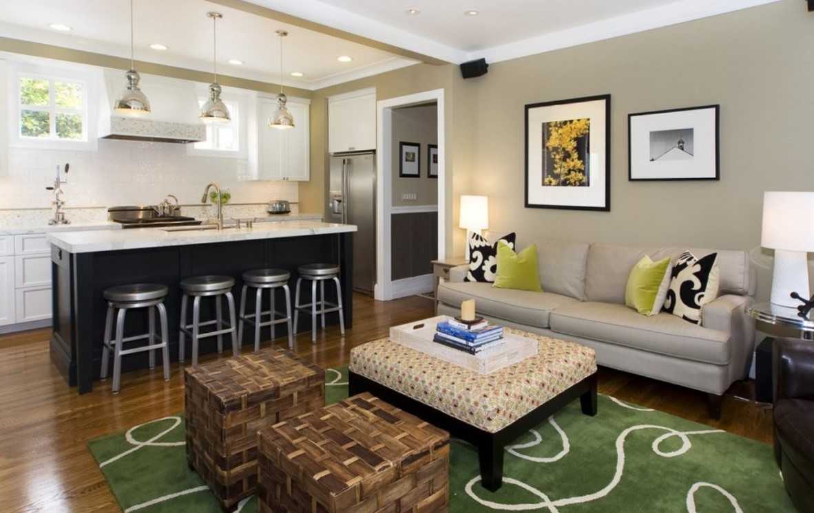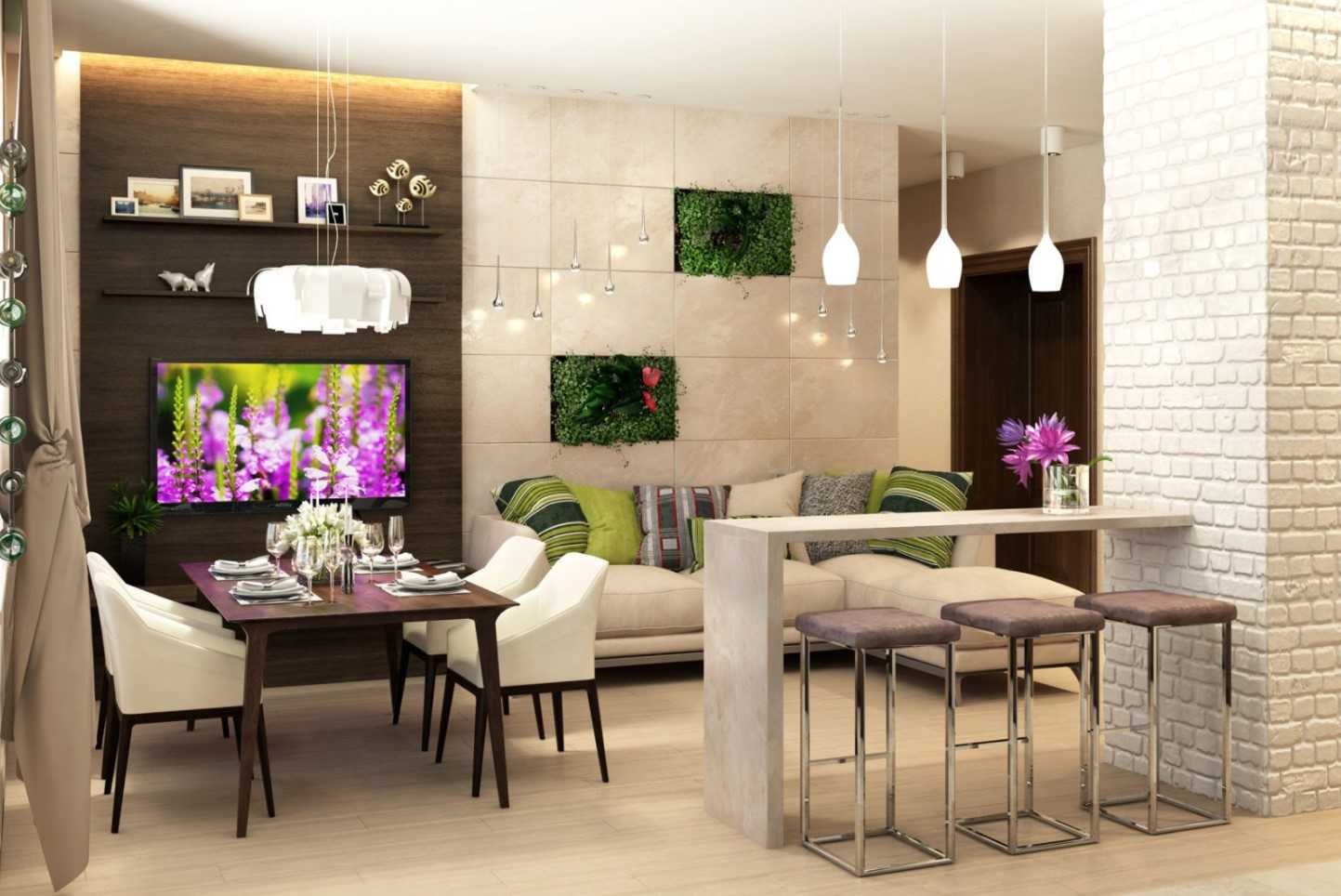 Оформление стен в совмещенной с залом кухне подчиняется немного другим законам: для создания гармонии нужно провести работу по зонированию и выделить акцентные стороны.