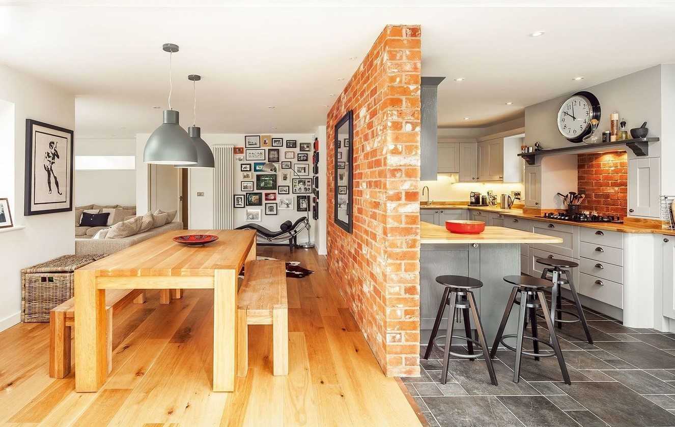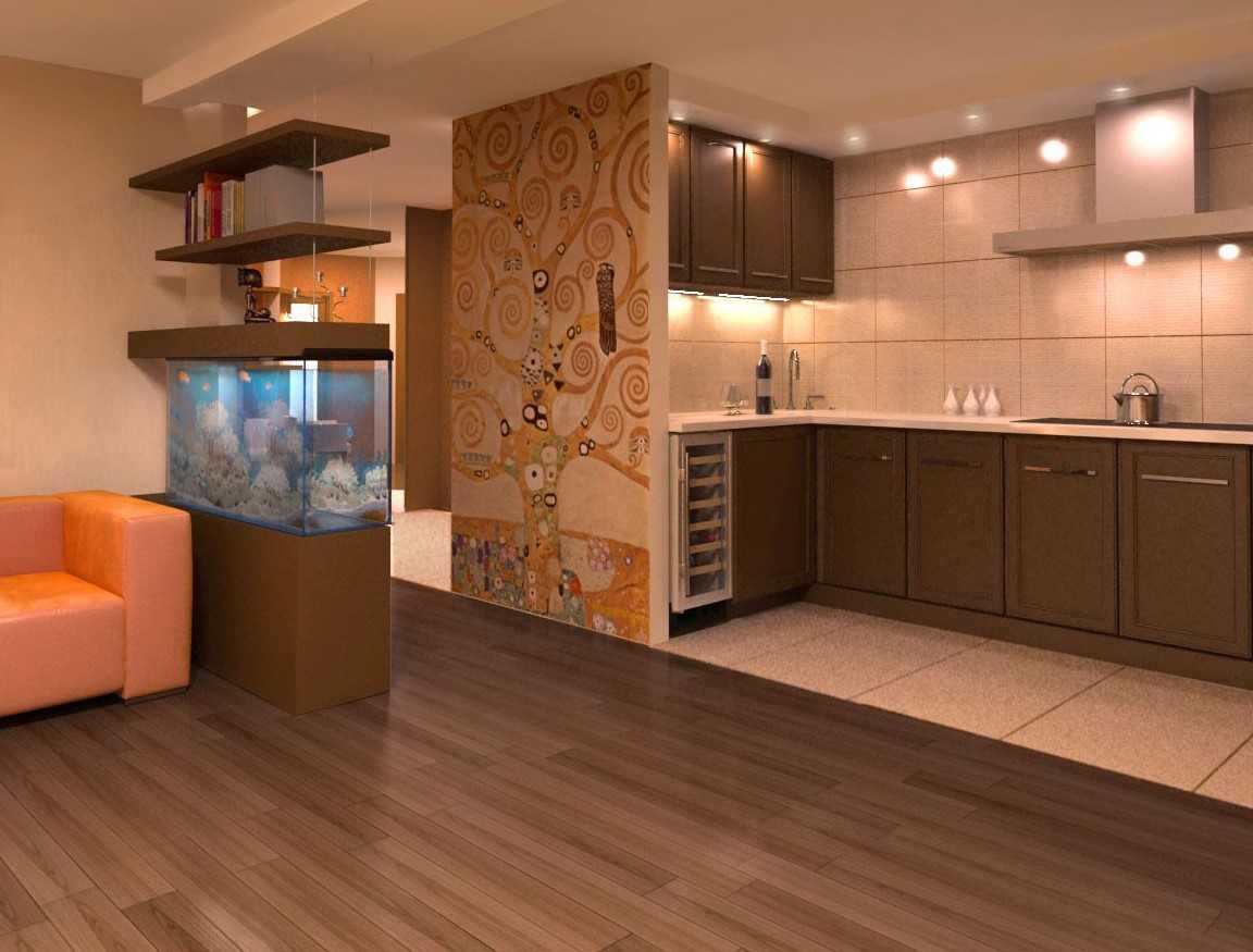 Чтобы стены выступили в качестве разделителей пространства, их нужно оформлять разными отделочными материалами. Либо использовать отличающиеся друг от друга орнаменты и изображения, если материал одинаков. Почти всегда разделение проходит по функциональному признаку — выделяются зоны готовки и принятия пищи (столовая) и отдыха (зал, гостиная).