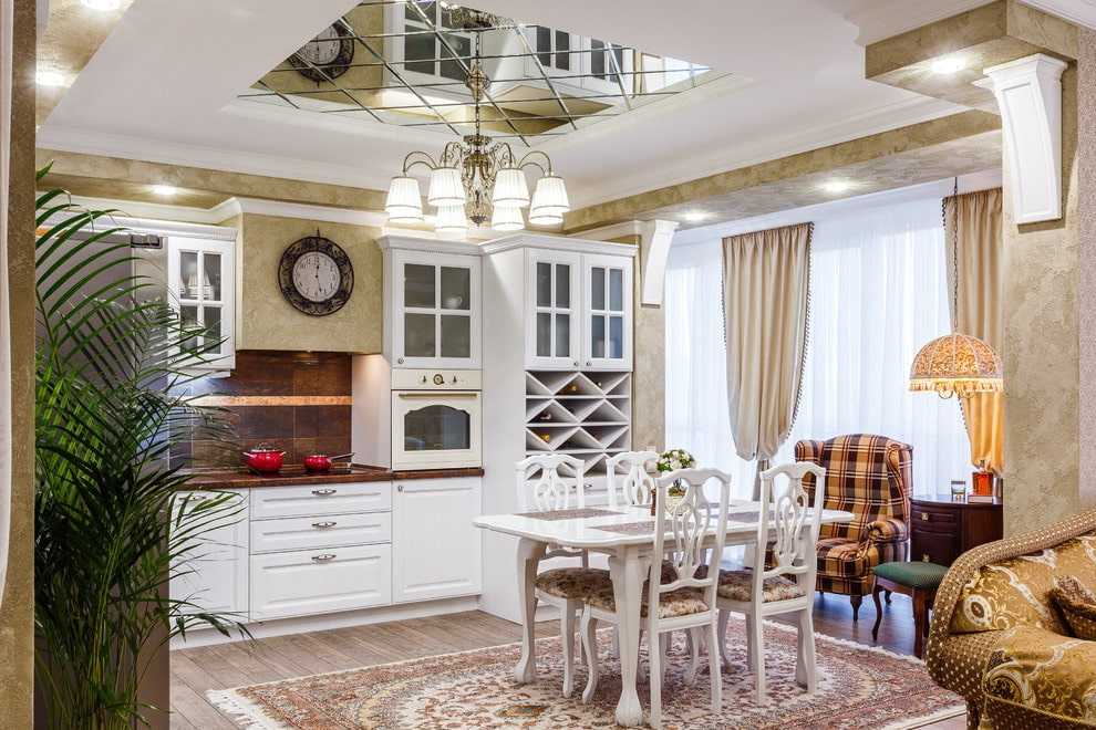 В данном случае важно правильно подобрать цвет стен и пола, чтобы кухня не казалась слишком темной. Можно сделать двойной потолок, комбинируя зеркала с другими материалами
