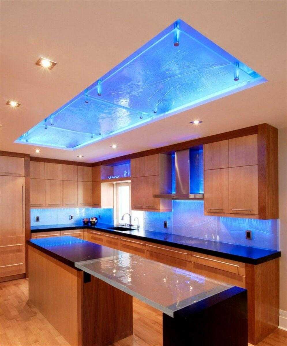 Натяжные потолки со светодиодной подсветкой будут очень красиво смотреться в интерьере кухни