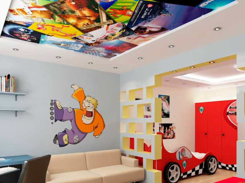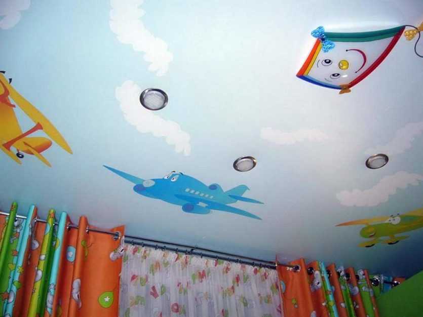 Полотно с рисунком хорошо тем, что через время все детали на потолке сохранят свои цвета и останутся на местах. С другой стороны рисунки на потолке в детской рискованный выбор в силу нескольких причин. Если лет в пять ваше чадо будет настаивать на ярком детском мультике, то уже через пару лет этот же мультик будет казаться ему слишком детским