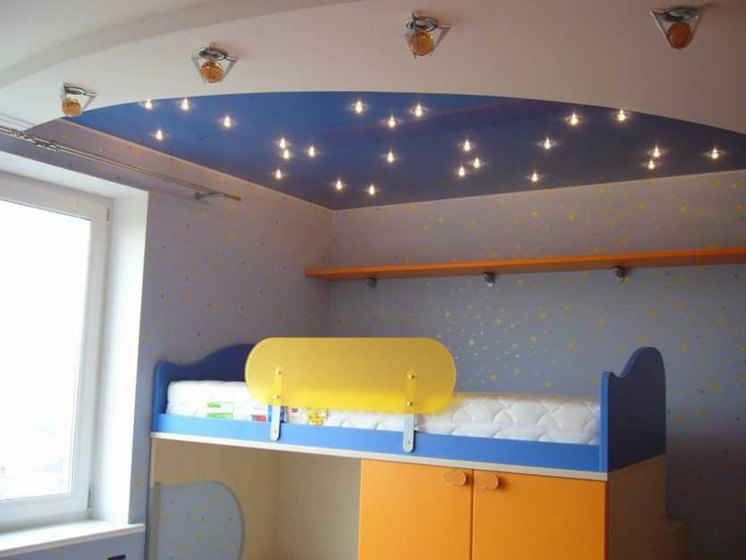 Этот вариант дизайна потолка в детской подойдет для деток школьного возраста, способных оценить красоту ночного неба. Создать эффект мерцающих звезд легко, есть неплохие примеры фото печати, качественно передающие изображение. Если ваша цель синий потолок со звездами в детской, выбираем из списка доступных решений: