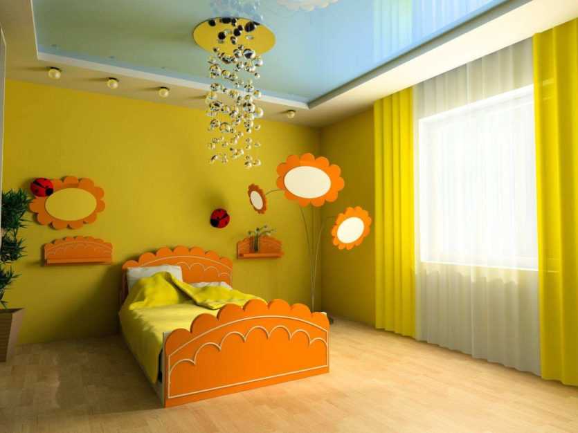 Но даже глянец может испортить атмосферу покоя в комнате, если переборщить с яркостью красок. Оранжевый потолок в детской обязательно наполнит комнату теплом и создаст настроение, но цвет должен быть мягким, немного разбавленным. Хорошо смотрятся цветные полотна, когда они выполнены в белом или одном из основных выбранных цветов. Если комната наполнена розовыми красками, потолок тоже может быть бледного пастельного розового оттенка.