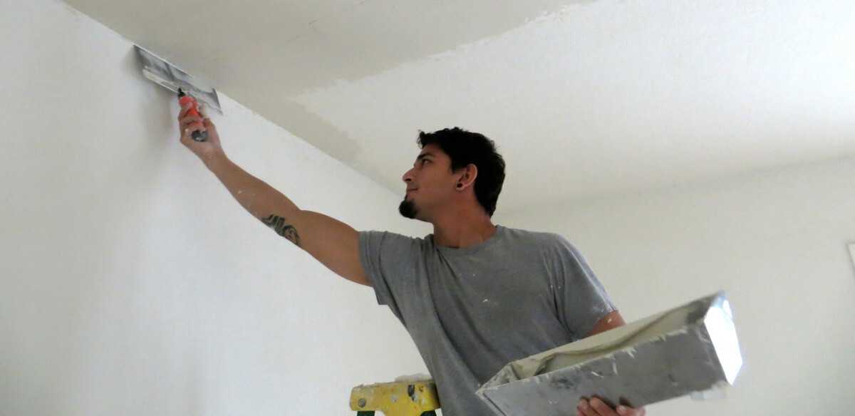 - Если размер неровностей не превышает пяти миллиметров, нет смысла затевать трудоемкую операцию. Достаточно прошпаклевать потолок, используя широкий шпатель и правило.
