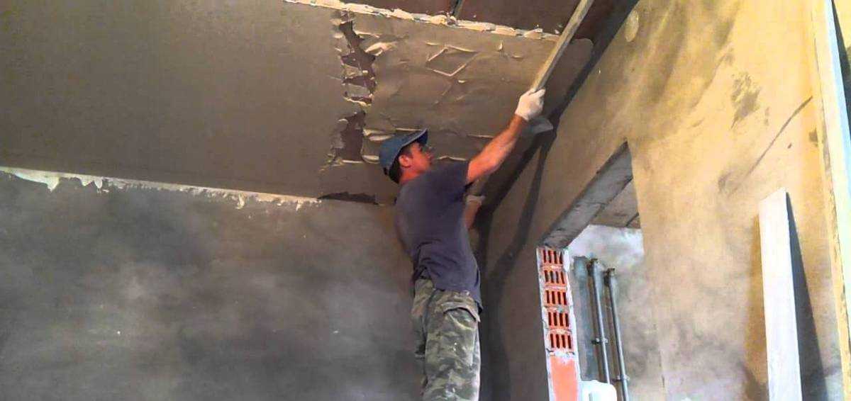 - Вооружившись жестким шпателем, зачистите поверхность потолка до плит перекрытия. В проблемных местах может пригодиться и перфоратор. В швах между плитами удалите всю слабо держащуюся штукатурку.
