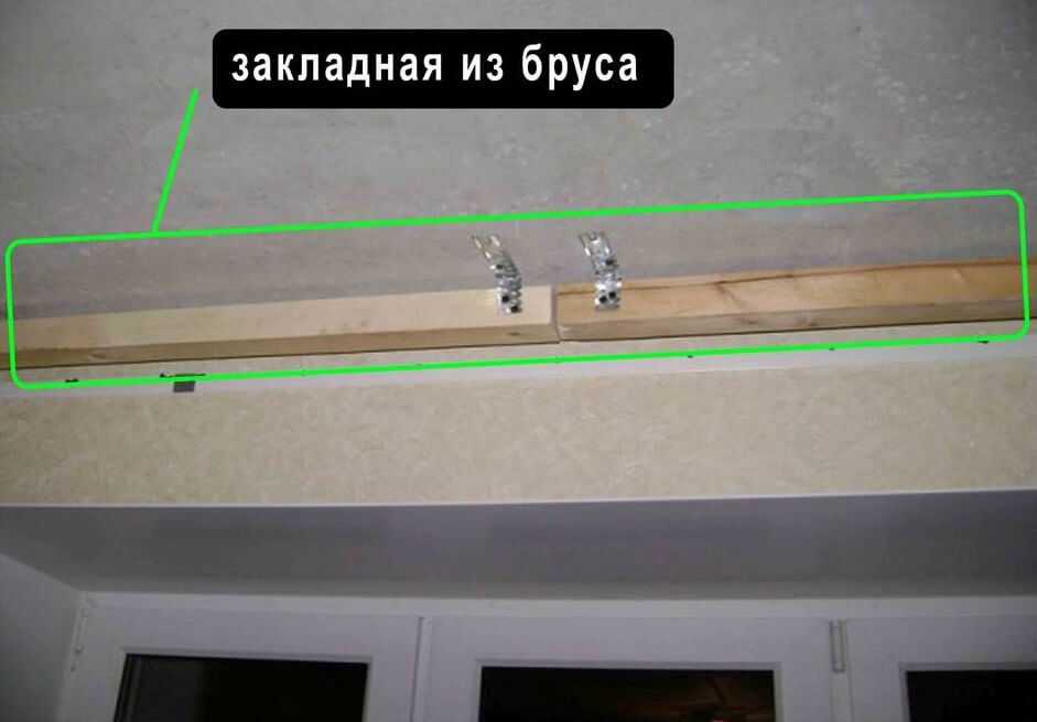 Для гардины используют брус, который крепится к базовому перекрытию на подвесах. Его нижняя плоскость должна находиться на уровне натяжного потолка. Пленка ПВХ натягивается под брусом. В местах крепления гардины на него приклеиваются протекторные кольца.