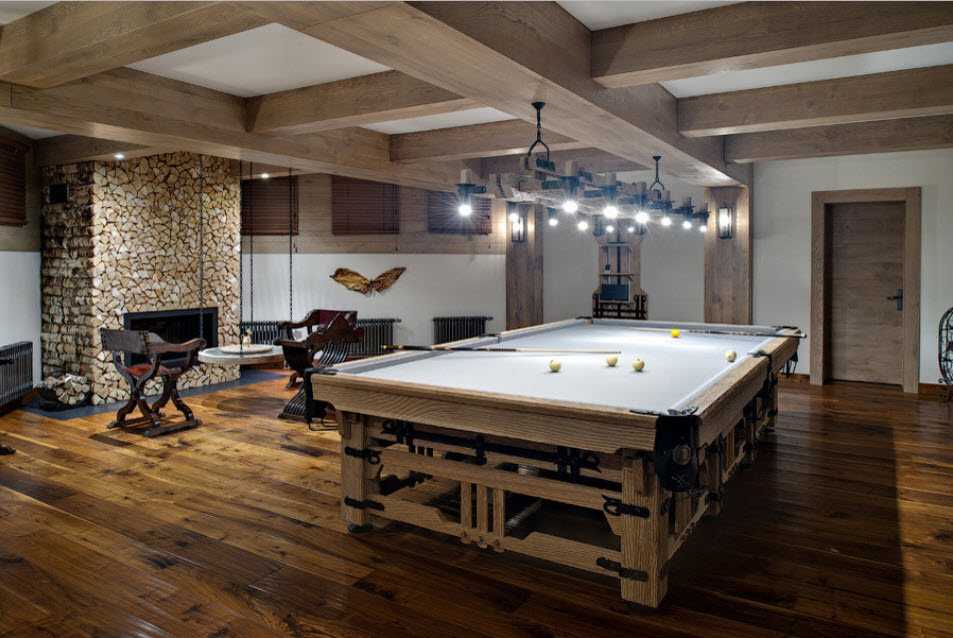 Потолок может стать самой необычной частью интерьера если его обшить деревянными массивными балками.