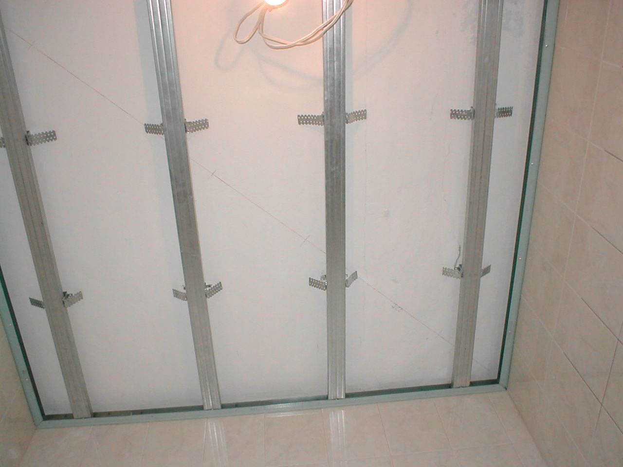 Ванная комната помещение с повышенным содержанием влаги, поэтому применять деревянный брус для каркаса под потолок в ванной из панелей не рекомендуется. Для этих целей идеально подойдет металлический оцинкованный профиль и П-образные подвесы для гипсокартонных потолков.