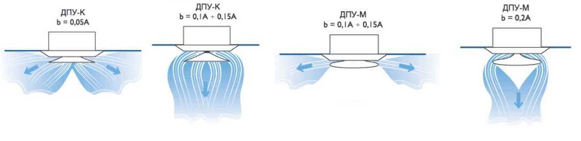Несколько приточных потолочных дефлекторов со схемами распространения воздуха