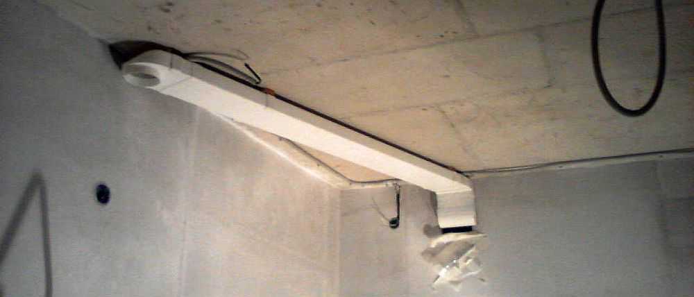 Если отвод сделан из гофрированного материала или есть желание сделать все «правильно», тяжелые корпуса подвешивают к потолку на шпильках или подвесах.