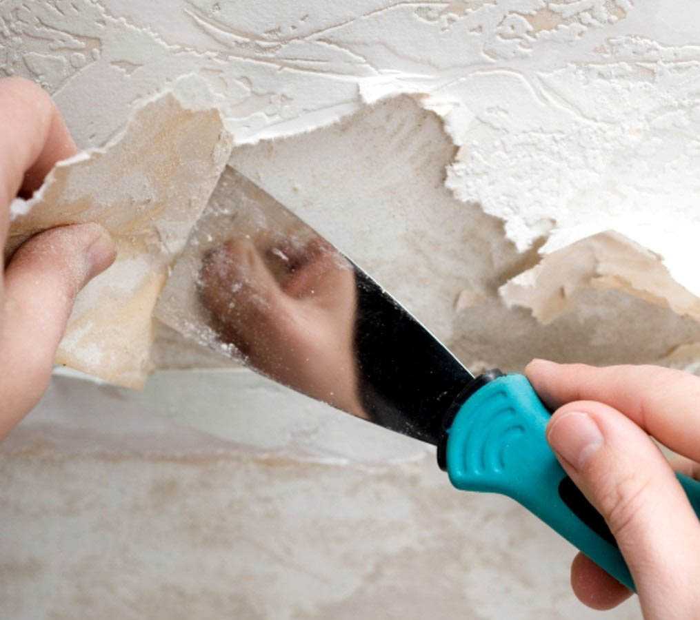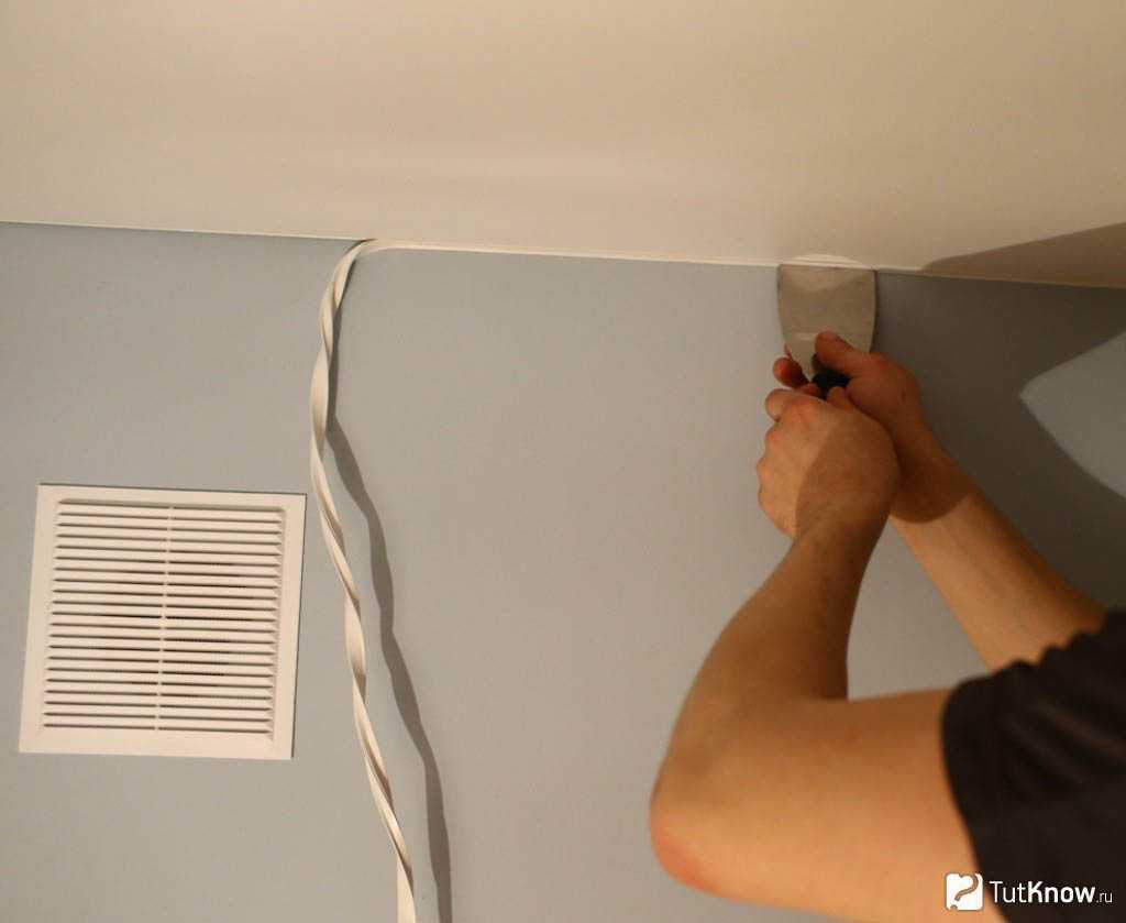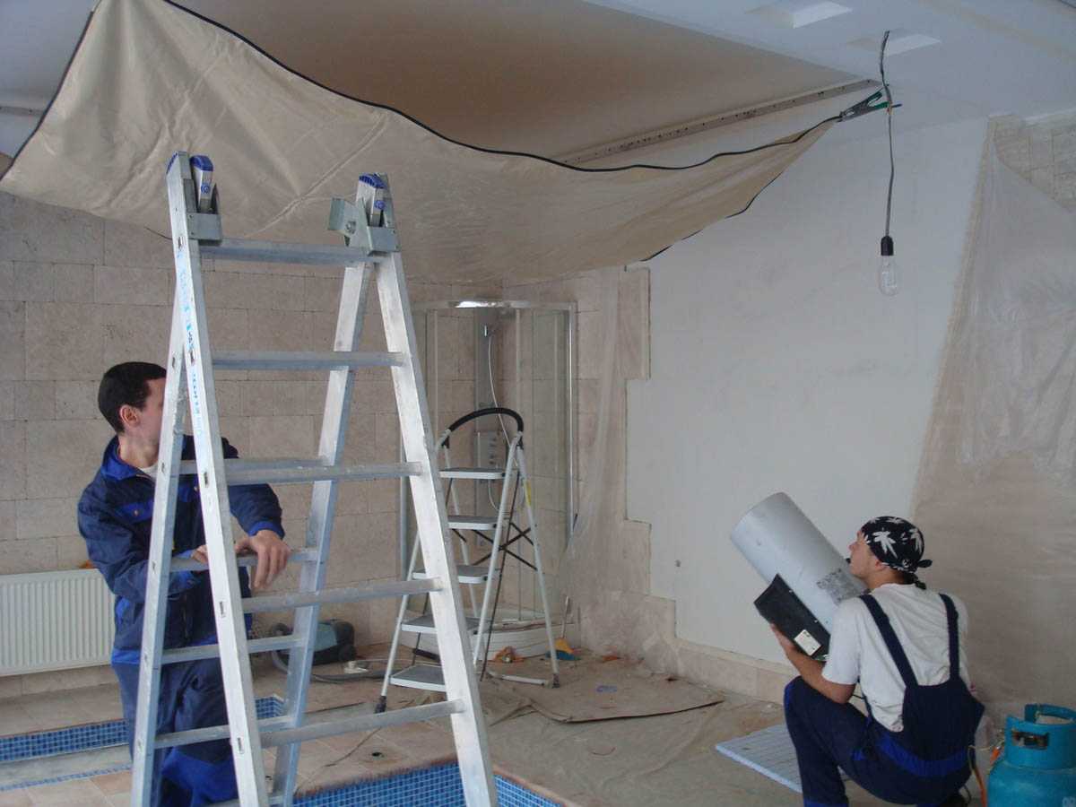 - если на потолке наблюдается отслоение старой штукатурки либо побелки, то необходимо удалить отживший свое слой во избежание риска повреждения уже натянутого полотна;