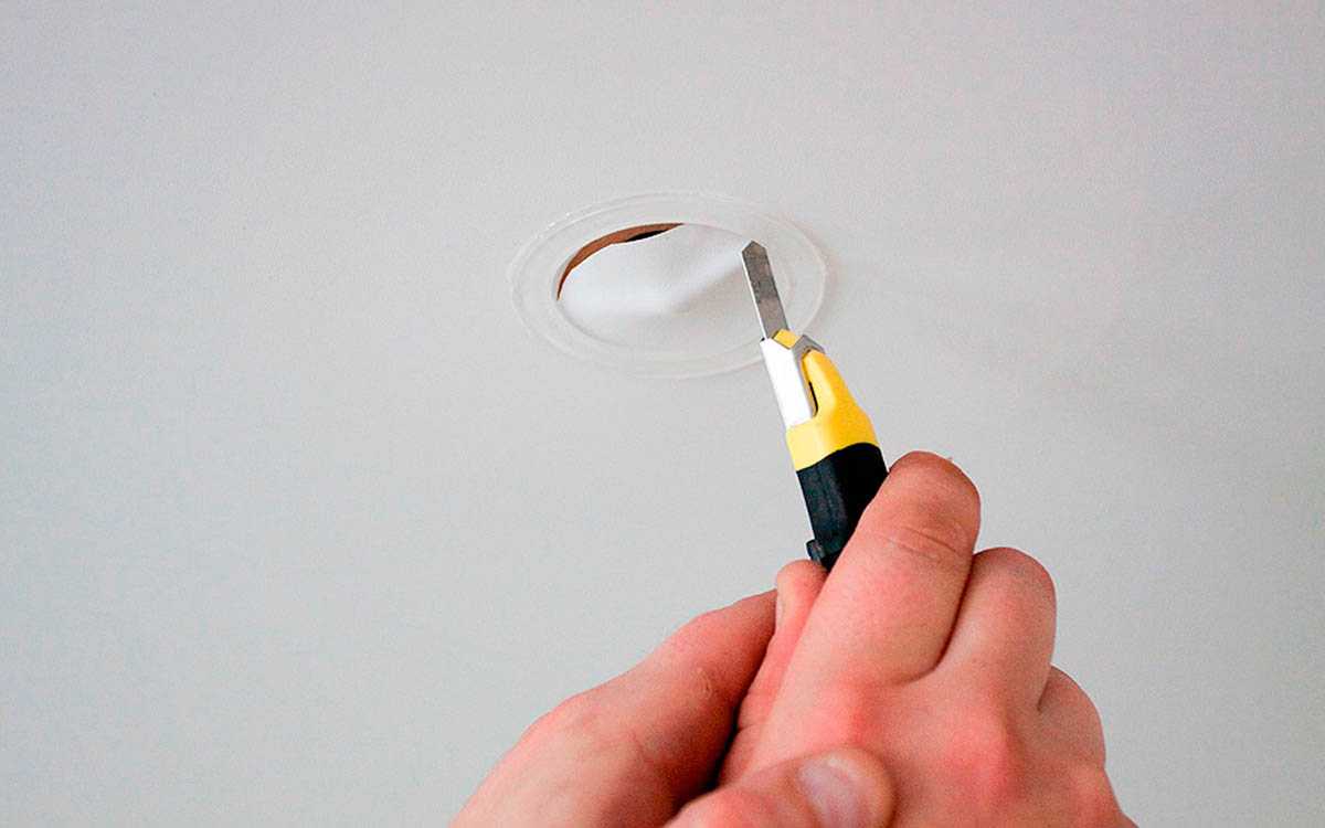 Когда защита приклеилась, плёнку внутри вырезают строительным ножом. Подравнивают закладную так, чтобы она была вровень с потолком. Вытаскивают провод, подключают светильник и ставят его на место. Встроенные модели имеют на корпусе пружины-фиксаторы, которые нужно прижать и вставить в отверстие на потолке.